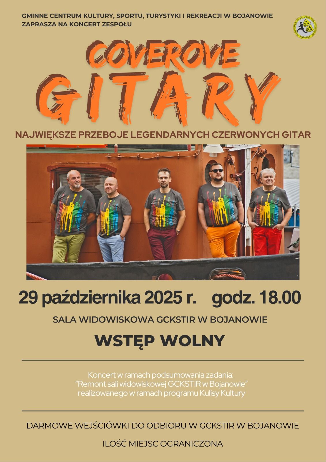 Gminne Centrum Kultury, Sportu, Turystyki i Rekreacji w Bojanowie zaprasza wszystkich mieszkańców na wyjątkowy koncert zespołu Coverove Gitary, który odbędzie się 29 października 2025 roku o godz. 18.00 w sali widowiskowej GCKSTiR.
