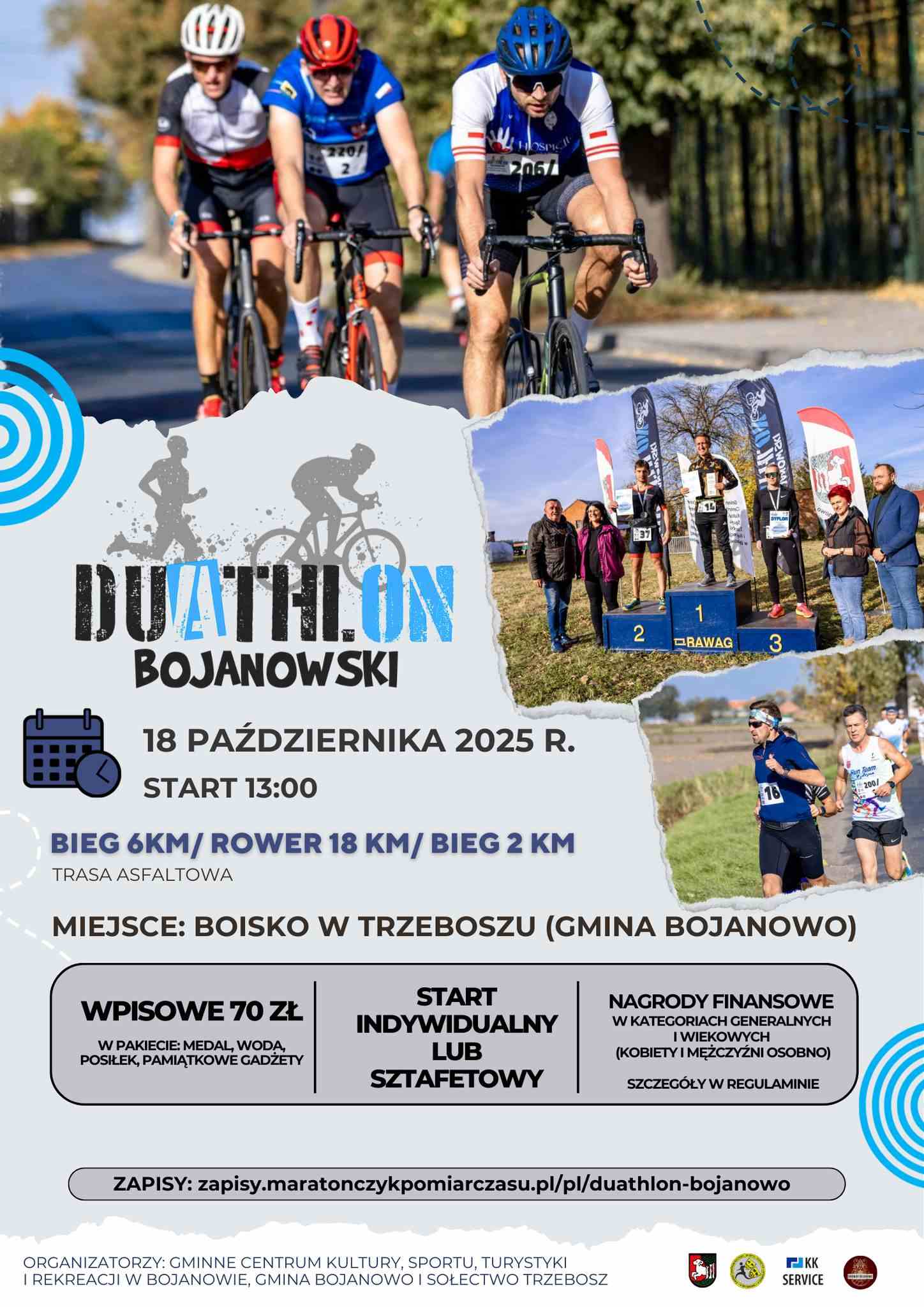 18 października 2025 roku w Trzeboszu (gmina Bojanowo) odbędzie się kolejna edycja Duathlonu Bojanowskiego. Sportowe zmagania rozpoczną się o godzinie 13:00 na boisku w Trzeboszu.