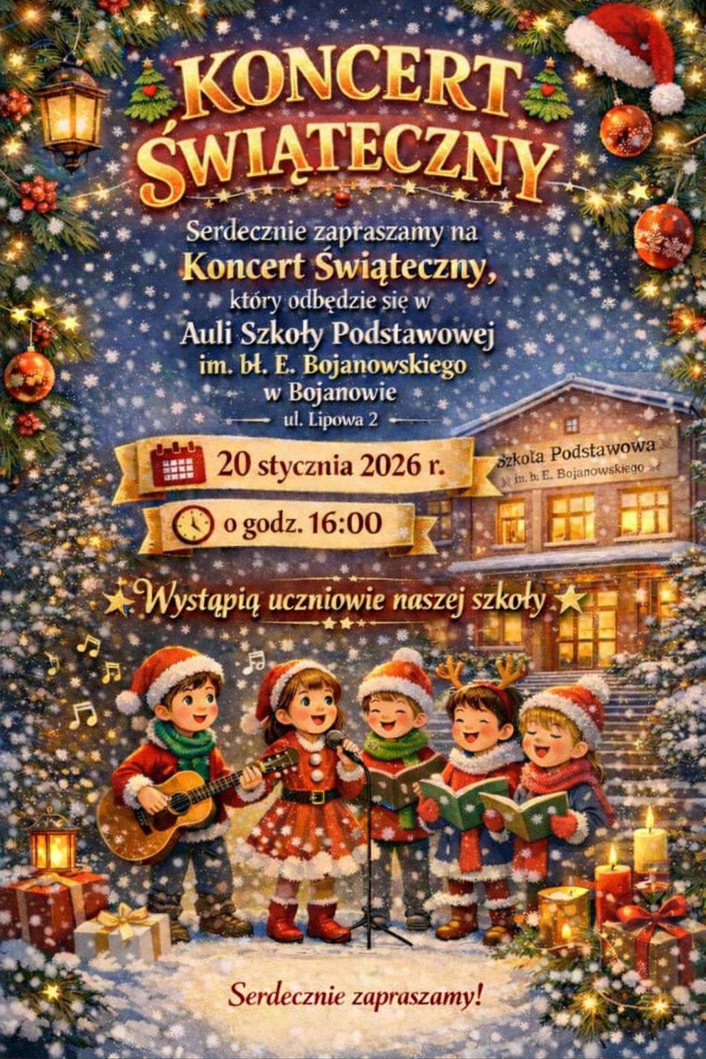 W Auli Szkoły Podstawowej im. bł. Edmunda Bojanowskiego w Bojanowie odbędzie się wyjątkowe wydarzenie muzyczne, które wprowadzi mieszkańców w świąteczny nastrój. Koncert Świąteczny zaplanowano na 20 stycznia 2026 roku o godzinie 16:00.
