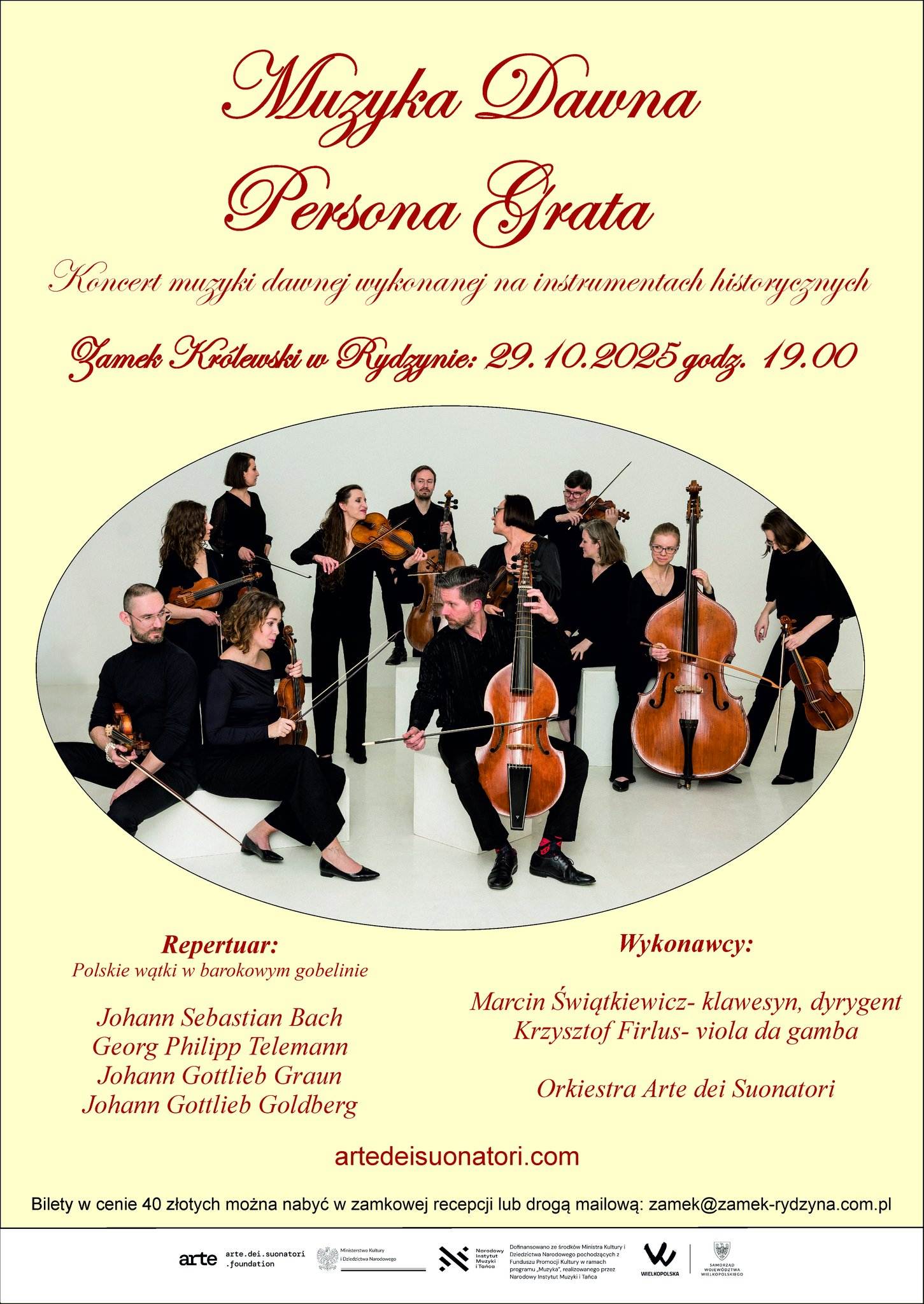 29 października 2025 roku o godz. 19:00, w murach Zamku Królewskiego w Rydzynie rozbrzmi muzyka sprzed wieków. Na scenie wystąpi znakomita Orkiestra Arte dei Suonatori w koncercie zatytułowanym „Muzyka Dawna – Persona Grata”.