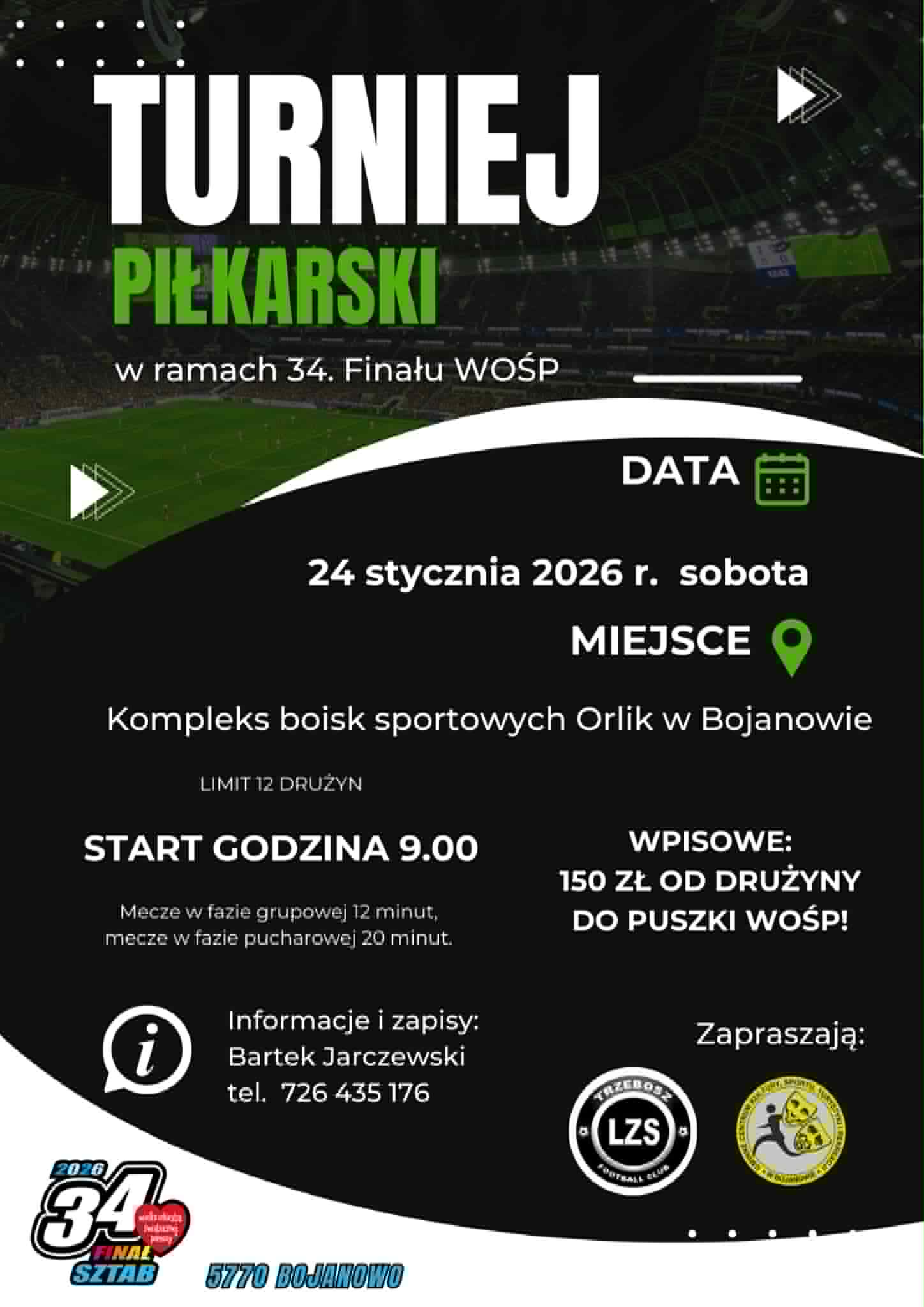 Sportowe emocje i pomoc w jednym – tak zapowiada się turniej piłkarski, który odbędzie się w sobotę, 24 stycznia 2026 roku, na kompleksie boisk Orlik w Bojanowie. Wydarzenie organizowane jest w ramach 34. Finału Wielka Orkiestra Świątecznej Pomocy.