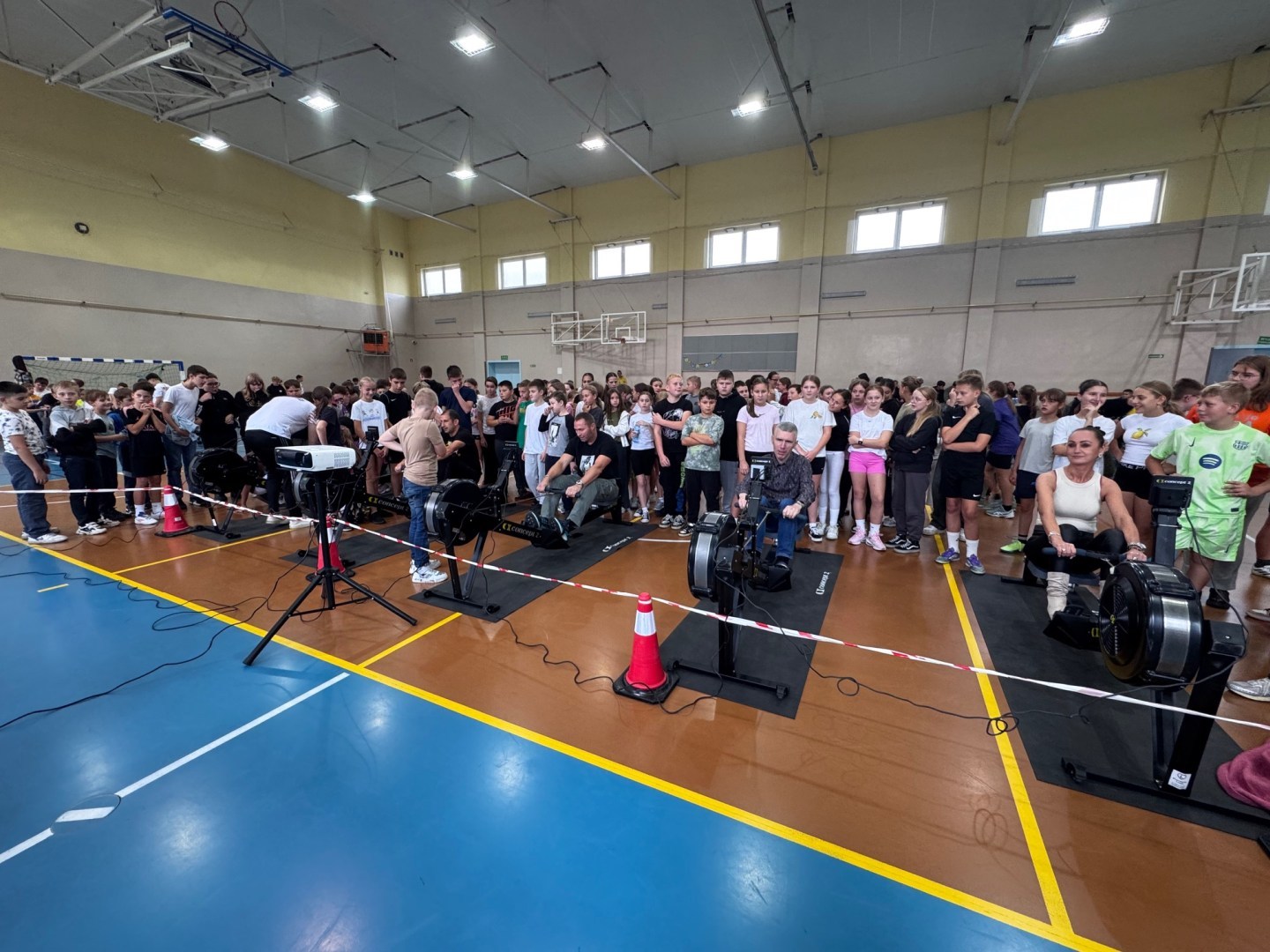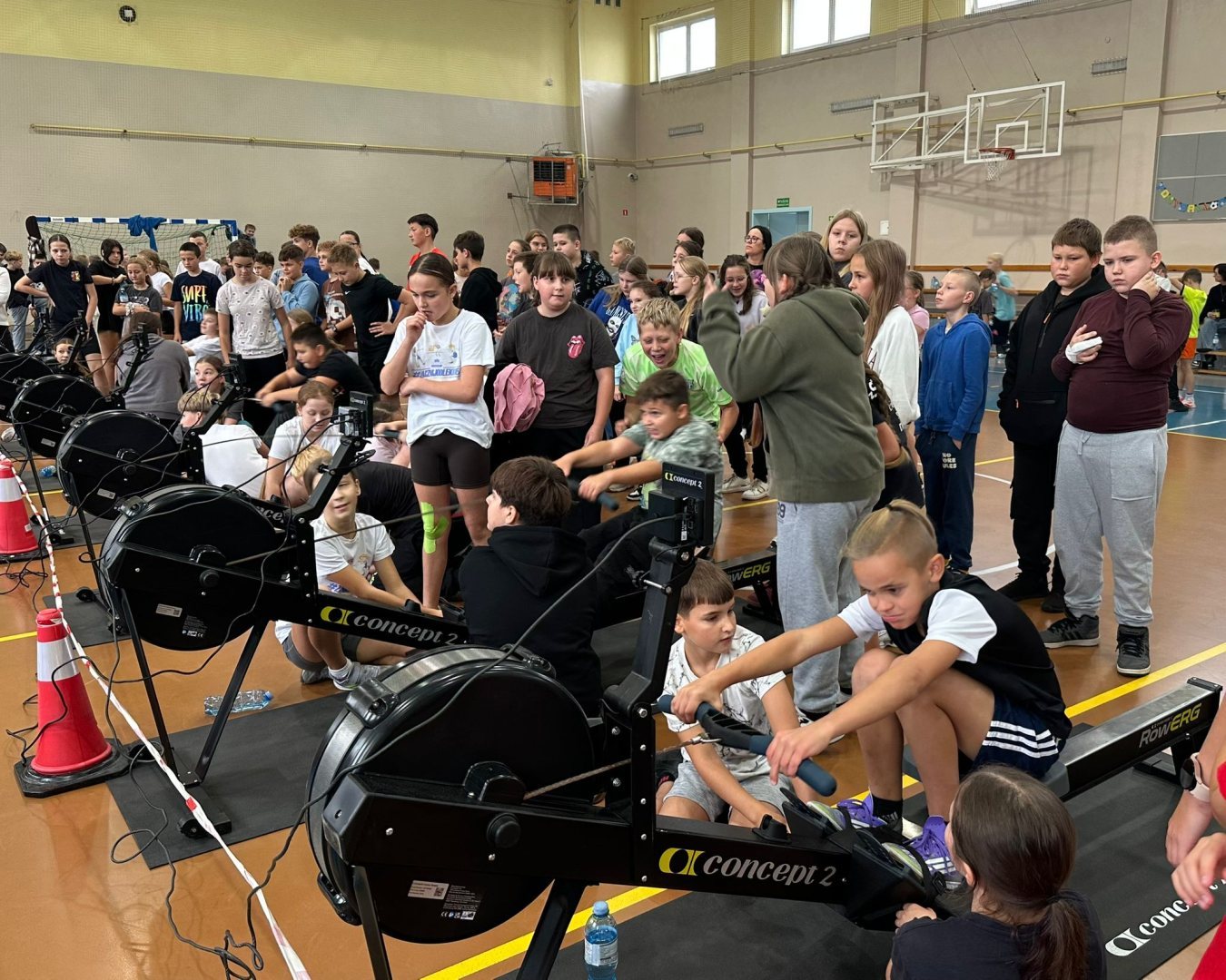 Uczniowie klas IV–VIII rywalizowali w sztafetach na ergometrach wioślarskich, wykazując się ogromnym zaangażowaniem, energią i duchem drużynowej współpracy. W jednej z konkurencji do uczniów dołączyli również przedstawiciele szkoły – wicedyrektor Damian Janasik oraz nauczyciele.